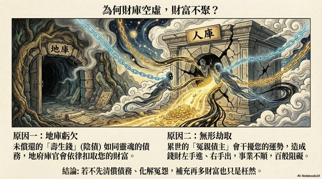 每個人的命運都與這三個無形的財庫緊密相連。天庫儲存福報,地庫記錄因果業債,人庫則顯化為現世的財富。三庫的狀態,直接決定了您的人生順遂與否。
