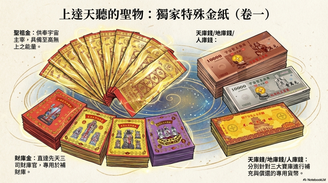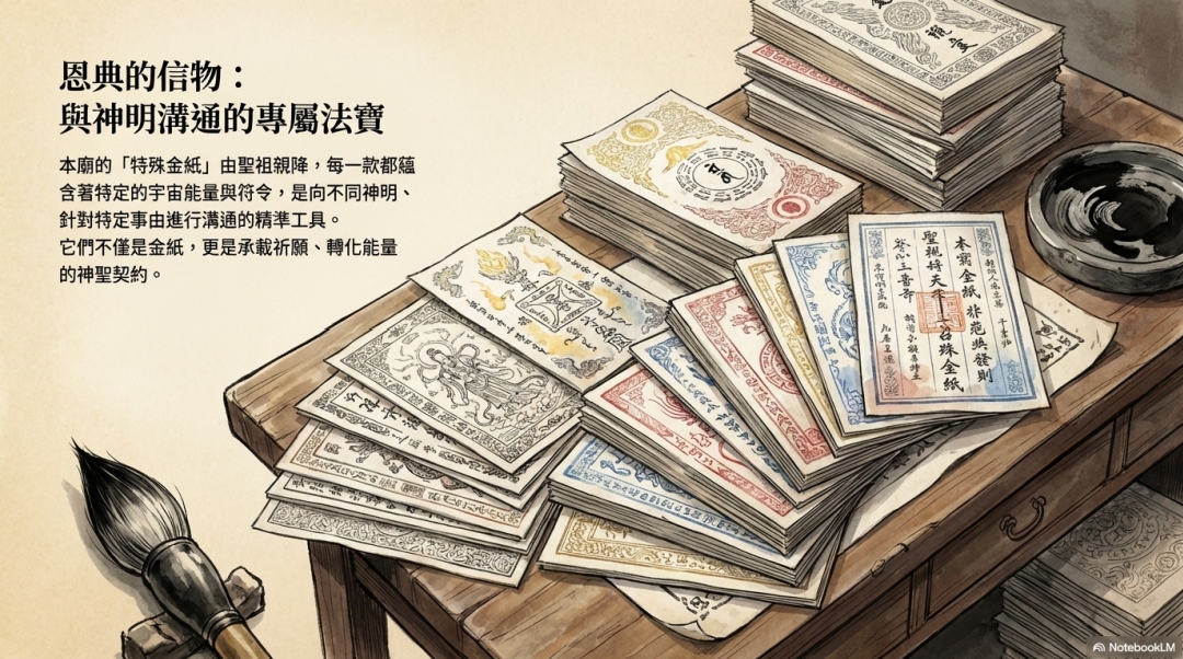 本廟的「特殊金紙」由聖祖親降,每一款都蘊 含著特定的宇宙能量與符令,是向不同神明、 針對特定事由進行溝通的精準工具。 它們不僅是金紙,更是承載祈願、轉化能量 的神聖契約。