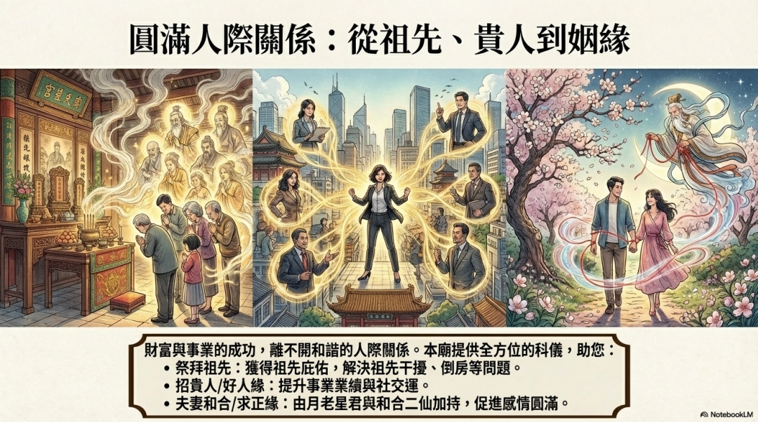 財富與事業的成功,離不開和諧的人際關係。本廟提供全方位的科儀,助您: