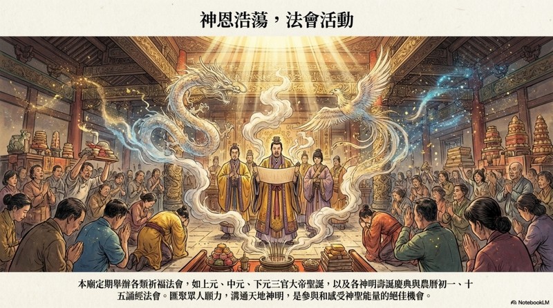 本廟定期舉辦各類祈福法會,如上元、中元、下元三官大帝聖誕,以及各神明壽誕慶典與農曆初一、十 五誦經法會。匯聚眾人願力,溝通天地神明,是參與和感受神聖能量的絕佳機會