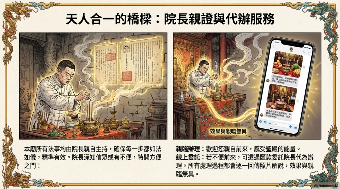 本廟所有法事均由院長親自主持,確保每一步都如法 如儀,精準有效。院長深知信眾或有不便,特開方便之門: