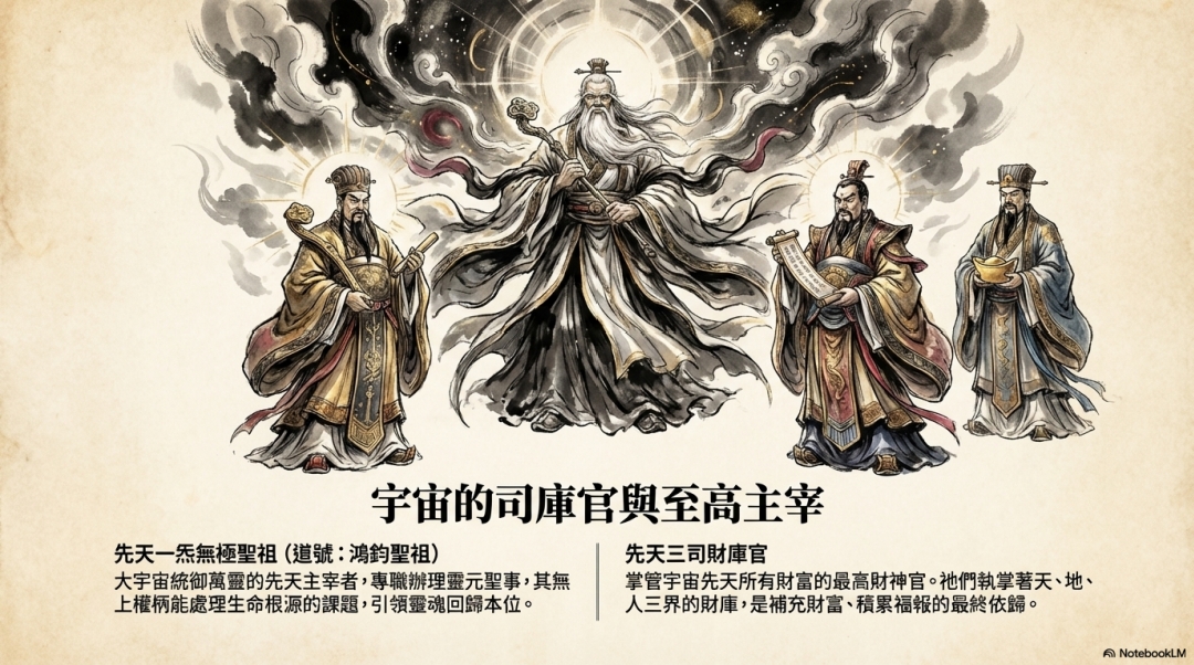 掌管宇宙先天所有財富的最高財神官。祂們執掌著天、地、 人三界的財庫,是補充財富、積累福報的最終依歸。
