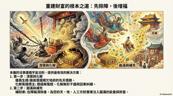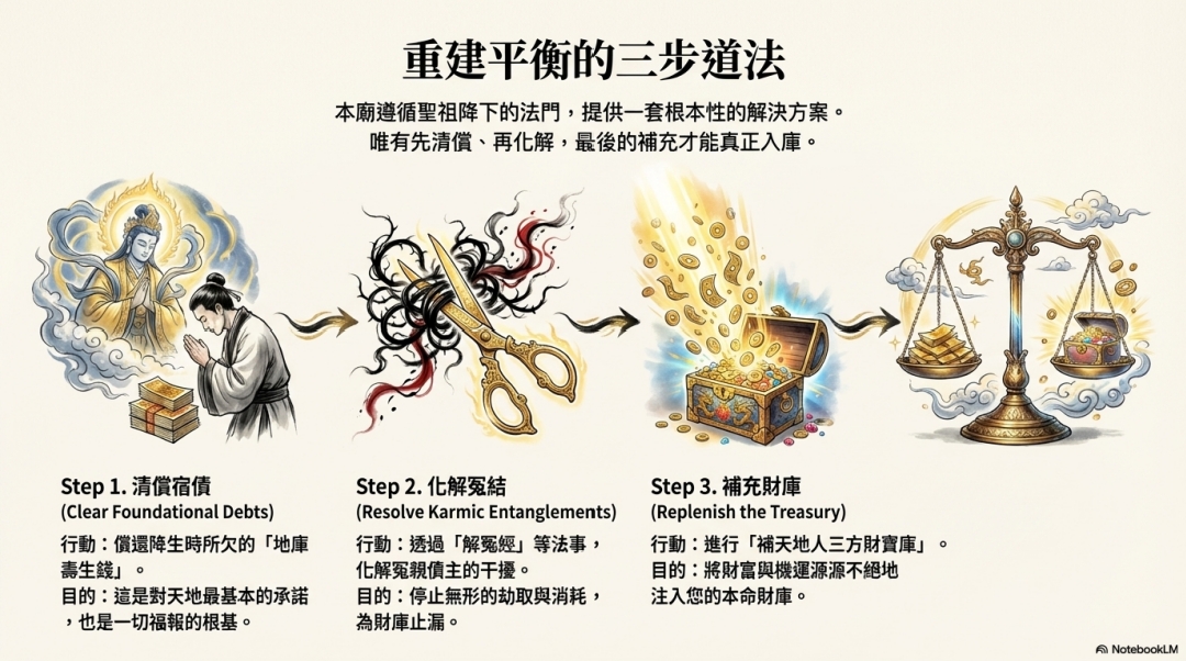 本廟遵循聖祖降下的法門,提供一套根本性的解決方案。 唯有先清償、再化解,最後的補充才能真正入庫。