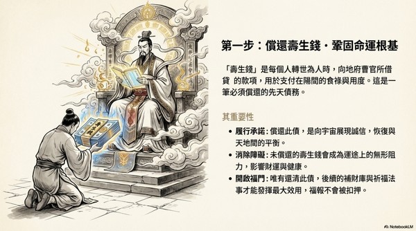 1. 第一步:清償與化解還壽生錢:徹底償還積欠地府的先天債務。