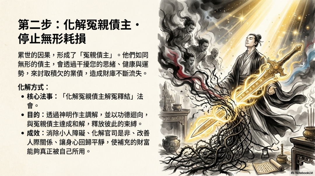 行動:透過「解冤經」等法事,化解冤親債主的干擾。