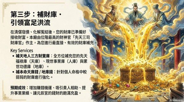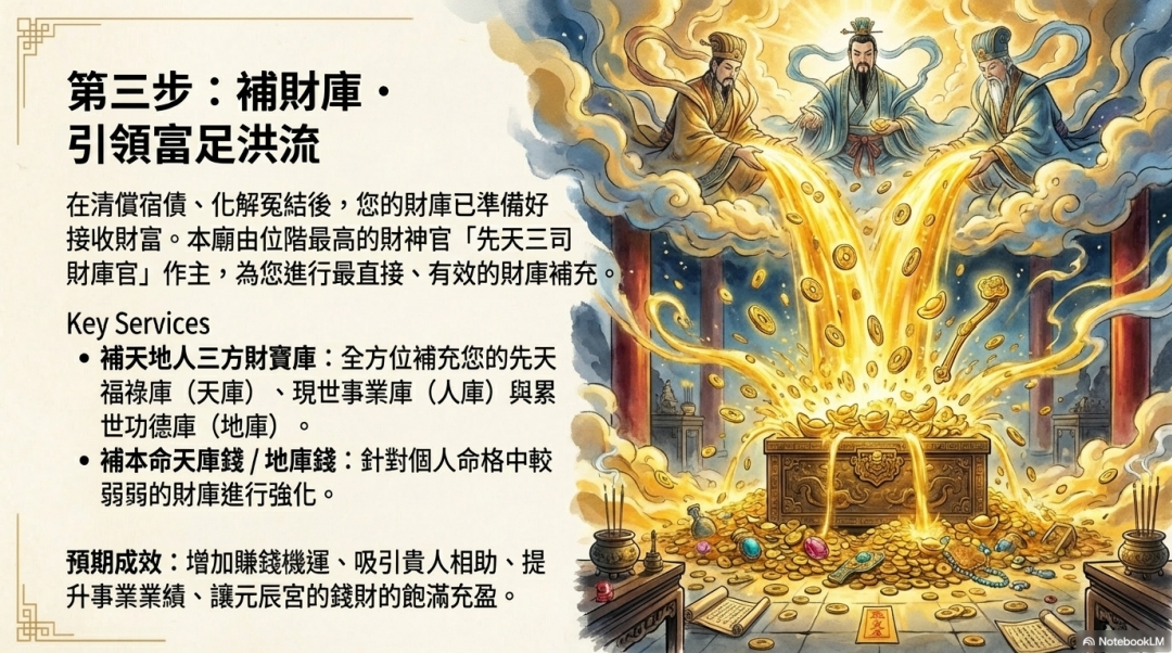 補財庫:在障礙清除後,為您的天、地、人三方財寶庫注入圓滿的能量與財富
