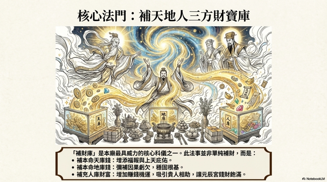 「補財庫」是本廟最具威力的核心科儀之一。此法事並非單純補財,而是: